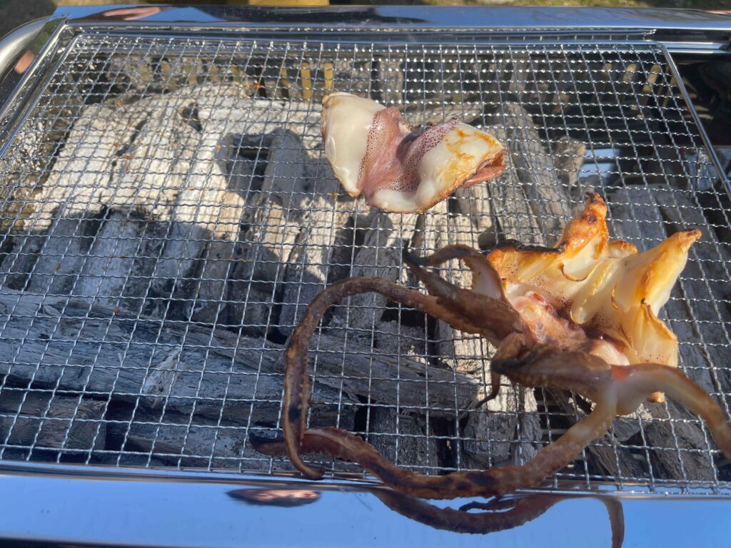 植栽後の交流会では、樵木備長炭で焼き上げた県南の食材を昼食として提供し、炭火を囲みながら参加者同士が交流するひとときとなりました。
